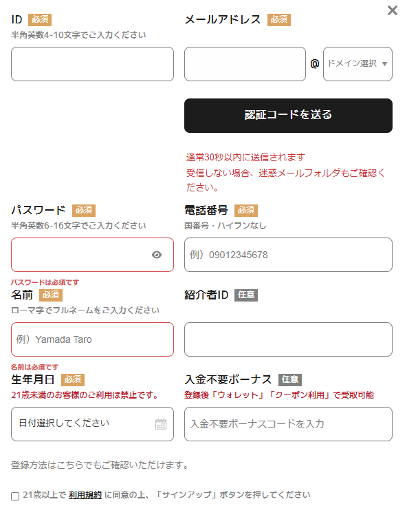 - 登録時のフォームの入金不要ボーナス欄に crypto4000 を入力
