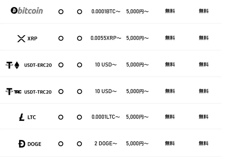 | 仮想通貨出金 | 通貨とネットワークによって変動 | 通貨によって変動~不明 | アドレス・チェーンを確認 |